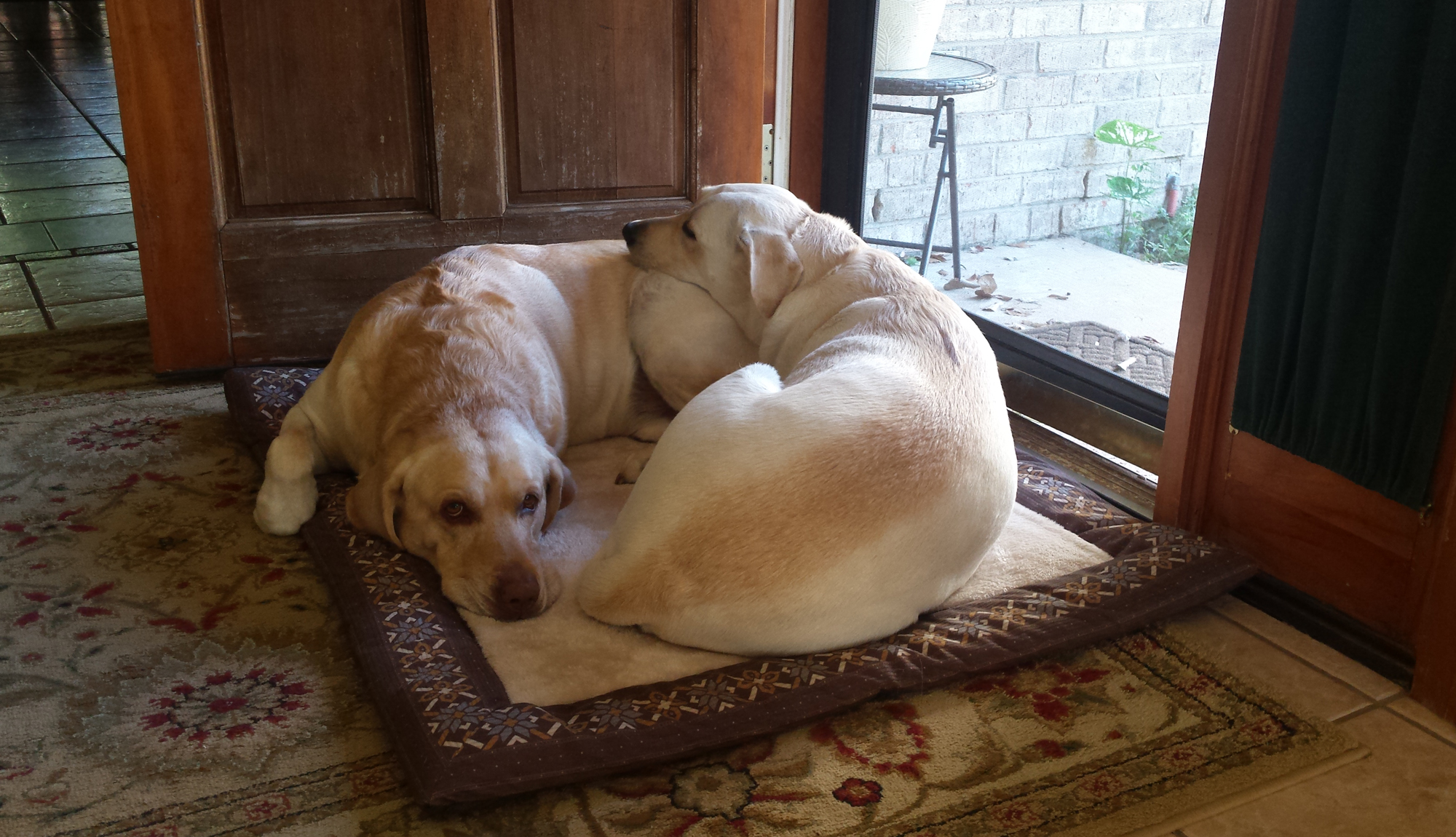 Bed Fellowsby MadisonRiley is a good bed-fellow. I often curl up on him and rest my chin on his back. Even if I have my own bed, I will still move over so I can lay closer to my Riley. I just moved from my bed to lay on Riley so we can look like a pile of big puppies.